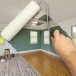 - Before and After of Man Using A Paint Roller to Reveal Newly Remodeled Room with Fresh Green Paint, Coffered Ceiling and New Floors.
